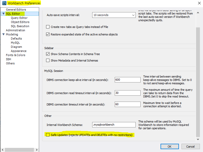 MySQL 상단 Edit → Preferences → SQL Editor → Safe Updates (rejects UPDATEs and DELETEs with no restrictions)