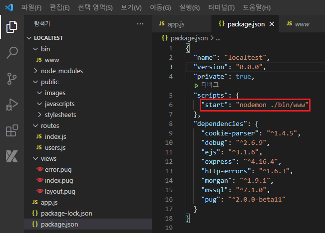 package.json 파일을 열어 빨간 테두리 부분만 수정한다.
