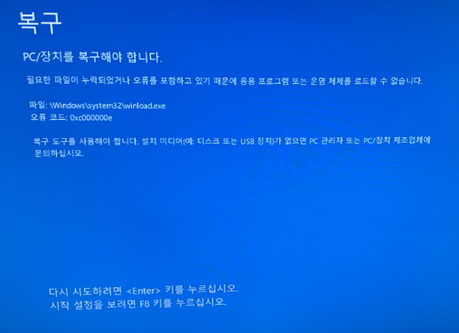 윈도우 부팅시 발생하는 "0xc000000e"오류의 형태는 주로 아래와 같습니다. pc /장치를 복구해야 합니다. 필요한 장치가 연결되어 있지 않거나 장치에 엑세스할 수 없습니다. 오류코드 0xc000